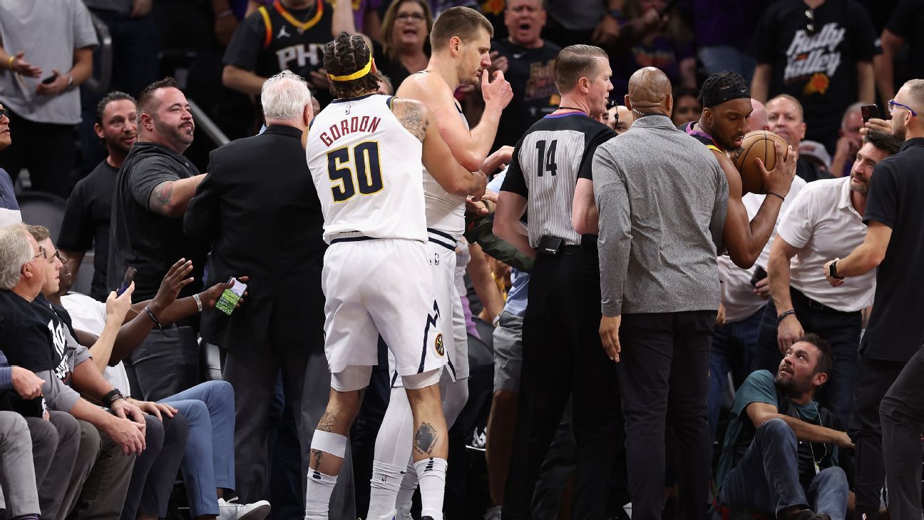 Nikola Jokic tangled with Suns owner Matt Ishbia while trying to deflect the ball from the stands.
